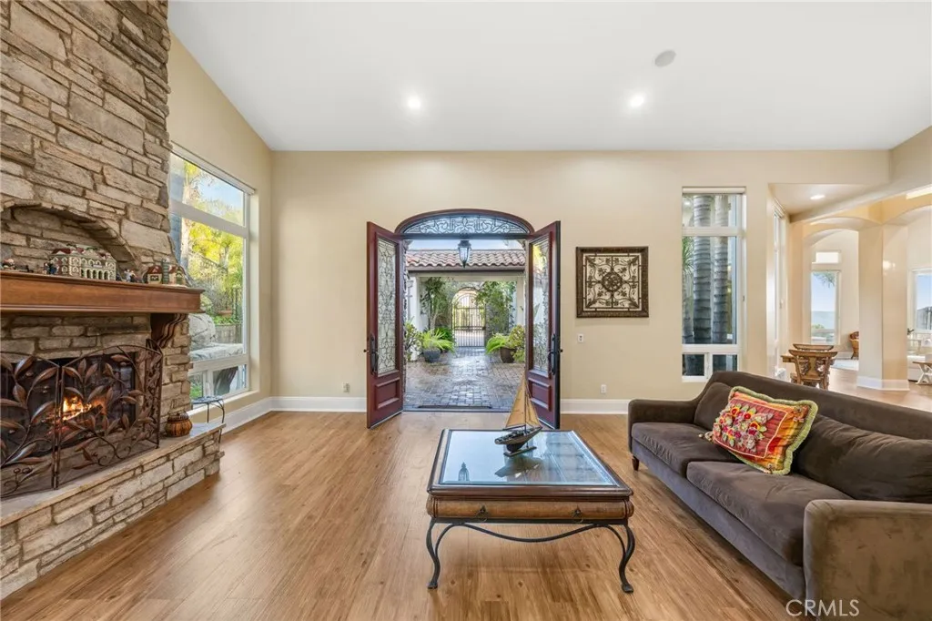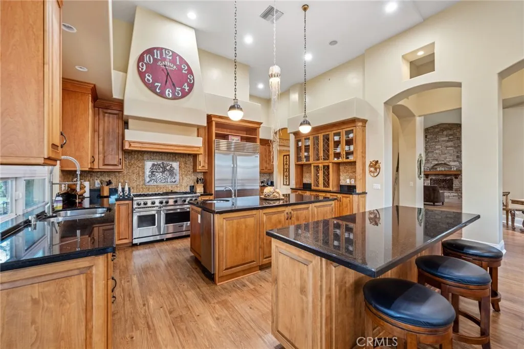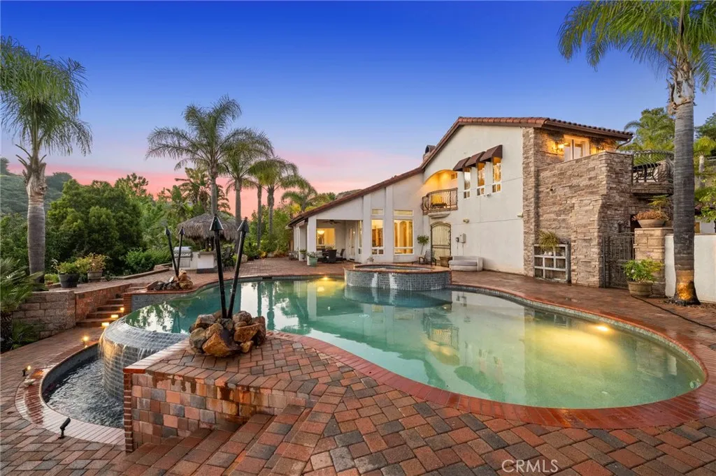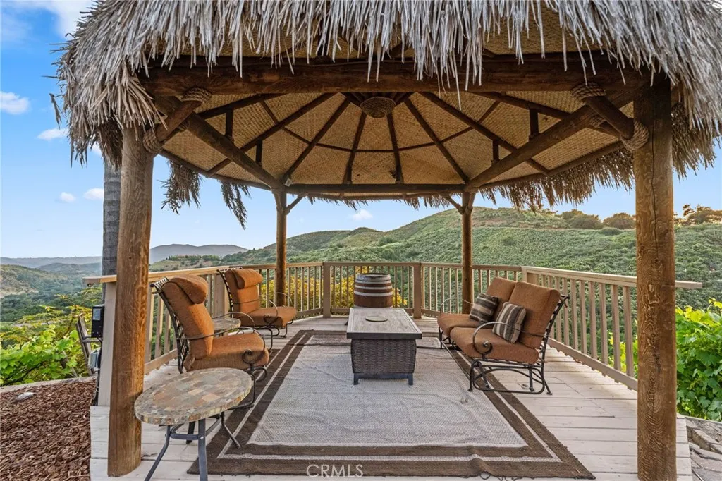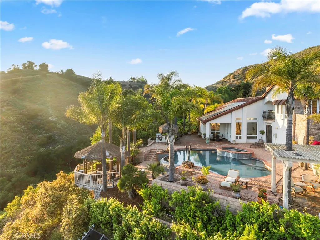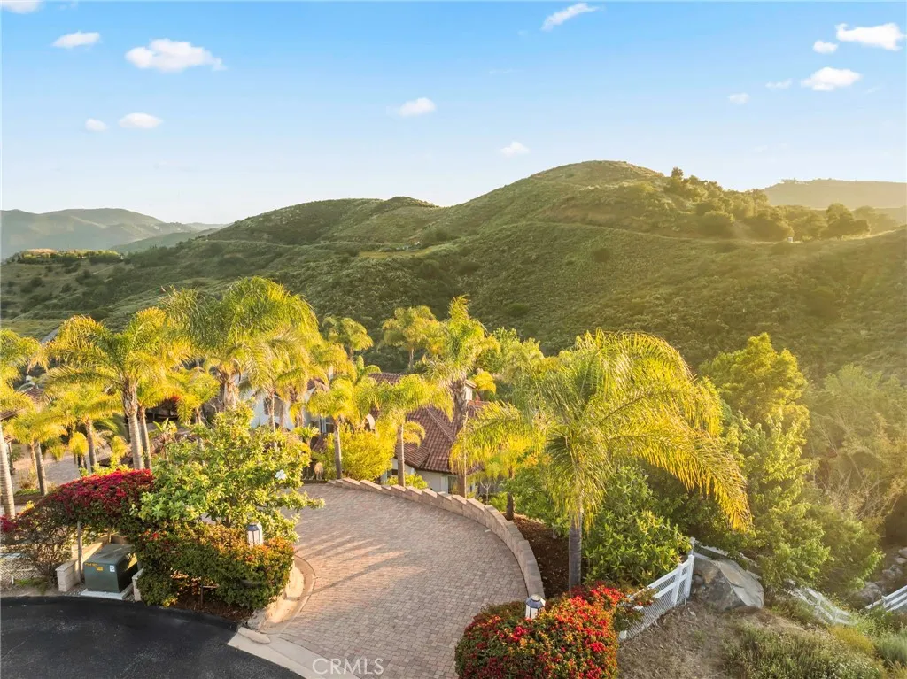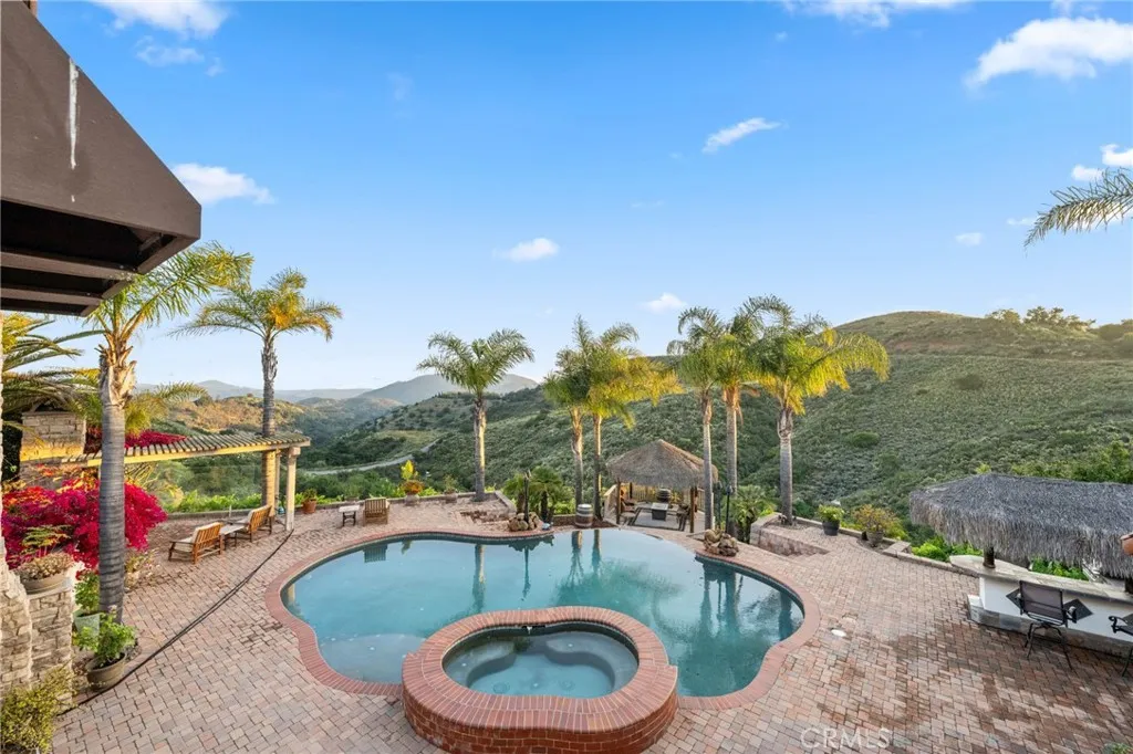Welcome to 44915 Palladian in the beautiful De Luz community in the hills above Old Town Temecula, tucked away in one of the most premiere privately gated communities in the Temecula Valley, Renaissance Estates. This luxury estate property on almost five acres is thoughtfully laid out with over 4400 square feet of living space, arriving through your very own private electric gate entrance. Beautiful gourmet kitchen with an abundance of wood cabinets and a six-burner Viking stove, Sub Zero refrigerator, and a large walk-in pantry. The main house features a huge master suite with a spacious master bath, including your own two-person jetted tub and a two-sided fireplace. The main house guest bedroom has a walk-in closet, private bath, and its own private patio. The separate casita tucked away close by is perfect for guests, visiting grown children or family, or teenagers wanting their own space. It has its own private living area with fireplace and private bath. There is a second separate guest quarters outside the main house with two balconies and a private bath, the only part of the estate on the second level with views abound. The backyard has a private infinity edge pool, raised spa, forever views all the way to the ocean, outdoor fireplace, palapa BBQ island, and lots of sitting areas. Tropical landscaping all around with many fruit trees. Beautifully finished four-car garage. There is a one-car separate garage attached to the main house that could easily be transformed into additional living space. PAID FOR SOLAR too! You just have to see this one to really feel how trul