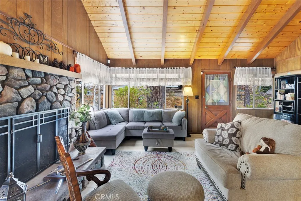Charming Wrightwood Mountain Retreat with Vaulted Cedar Ceilings and Dual Fireplaces! Welcome to this warm and inviting home situated on a spacious 8,805 sq. ft. corner lot in the heart of beautiful Wrightwood, California. This mountain community is known for its fresh air, four seasons, and outdoor recreationincluding Mountain High Ski Resort, hiking and biking trails, fishing at nearby Jackson Lake, and charming local shops and restaurants in the Wrightwood Village area. Step inside to a large living room featuring stunning cedar beam vaulted ceilings and a cozy fireplace, creating the perfect mountain ambiance. The cedar ceilings continue into the dining area and kitchen, adding warmth and character throughout. A very spacious family room also features cedar beam vaulted ceilings, a second fireplace, and a built-in bar with a sink and refrigeratorideal for entertaining or relaxing with friends. From here, a door leads to the backyard, where youll find a beautiful brick patio perfect for outdoor gatherings. This home offers central air and heat, newer vinyl waterproof flooring (installed in 2023), and a firewood storage shed with an attached storage closet for convenience. The detached two-car garage includes a laundry room, providing added functionality. Whether youre looking for a full-time residence or a weekend getaway, this Wrightwood property combines rustic charm, modern comfort, and proximity to all the mountain activities the area is known for.