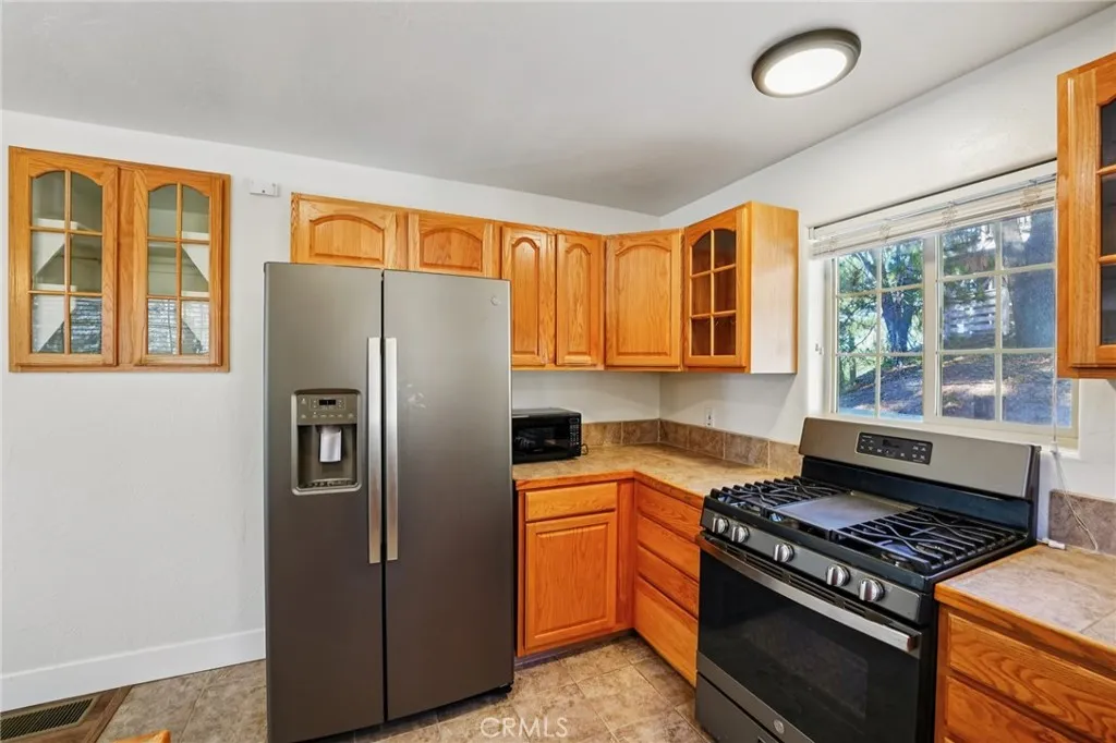 Enjoy peaceful treetop views from your private deck in this charming corner-lot home featuring standout curb appeal with a fresh rich blue exterior. The upper-level main floor offers an open and inviting layout with connected living and dining spaces, vinyl flooring, and a kitchen complete with stainless steel appliances. This level includes two bedrooms and a full bathroom, with one bedroom offering a walk in closet and direct access to the serene back deck, perfect for morning coffee or gatherings. The lower level features a convenient powder room and direct access to the oversized 2-car garage, equipped with abundant storage, epoxy flooring, and a laundry room. Located just 5 minutes from town in Running Springs, 15 minutes to Lake Arrowhead and Snow Summit Ski Resort, and 30 minutes to Big Bear Lake, this home provides the ideal blend of comfort, convenience, and mountain lifestyle.