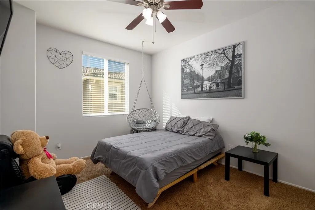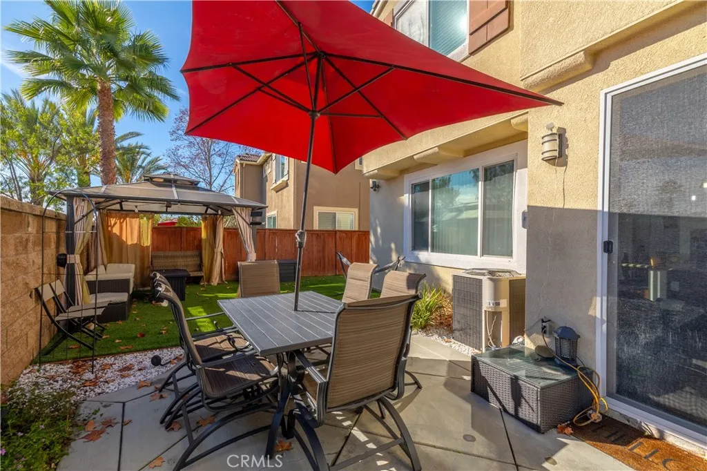 FHA/VA Approved! 3 BED, 2.5 BATH CONDO. Featuring PRIVATE ENTRY and an ATTACHED 2-CAR GARAGE, creating the feel of a standalone residence. SOLAR and BACK-UP BATTERY perfect for Electric Vehicles! CLOSE to FREEWAY, SHOPPING and SCHOOLS. The main level welcomes you with a formal entry and living space, highlighted by wood flooring throughout. Just off the kitchen, the spacious family room is perfect for relaxing or entertaining. The kitchen is thoughtfully designed with granite countertops, rich dark cabinetry, and ample storage, while abundant natural light pours in from the backyard, creating a bright and inviting atmosphere. Main level also includes laundry room and half bathroom with pedestal sink. Step outside to your private backyard oasis, complete with artificial turf, a concrete patio, and a gazebo included for shadeideal for outdoor dining, playtime, or unwinding after a long day. Upstairs, the primary suite offers a peaceful retreat with a private bathroom featuring dual sinks, a walk-in shower, and a walk-in closet. Down the hall, youll find two generously sized guest bedrooms and a full bathroom with a tub/shower combo, perfect for family or guests. Additional highlights include solar with a backup battery, providing excellent energy savings and efficiency. The community offers resort-style amenities, including a pool, park, and front yard maintenance covered by the HOA, making for low-maintenance living. Conveniently located just off the 215 freeway, this home is close to Costco, gas stations, Starbucks, Target, shopping, dining, and everyday essentials. Plus, h
