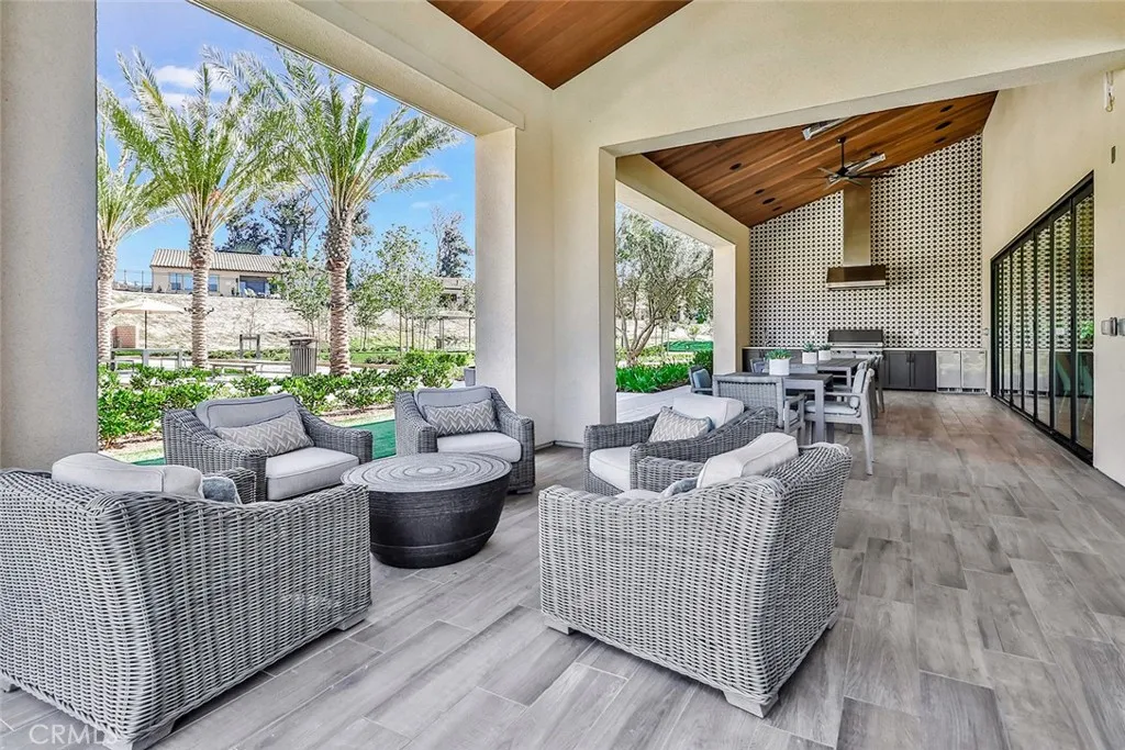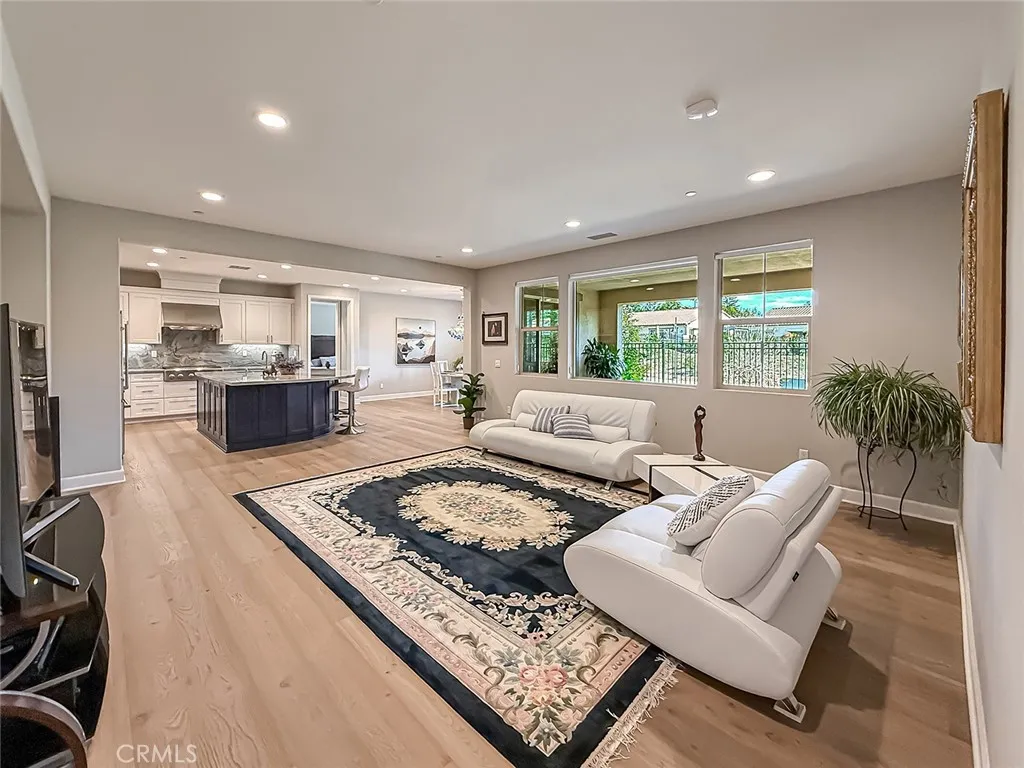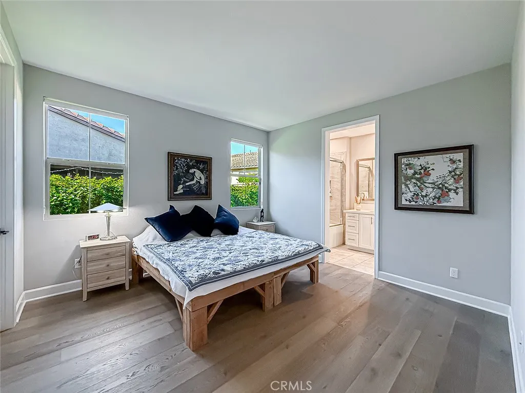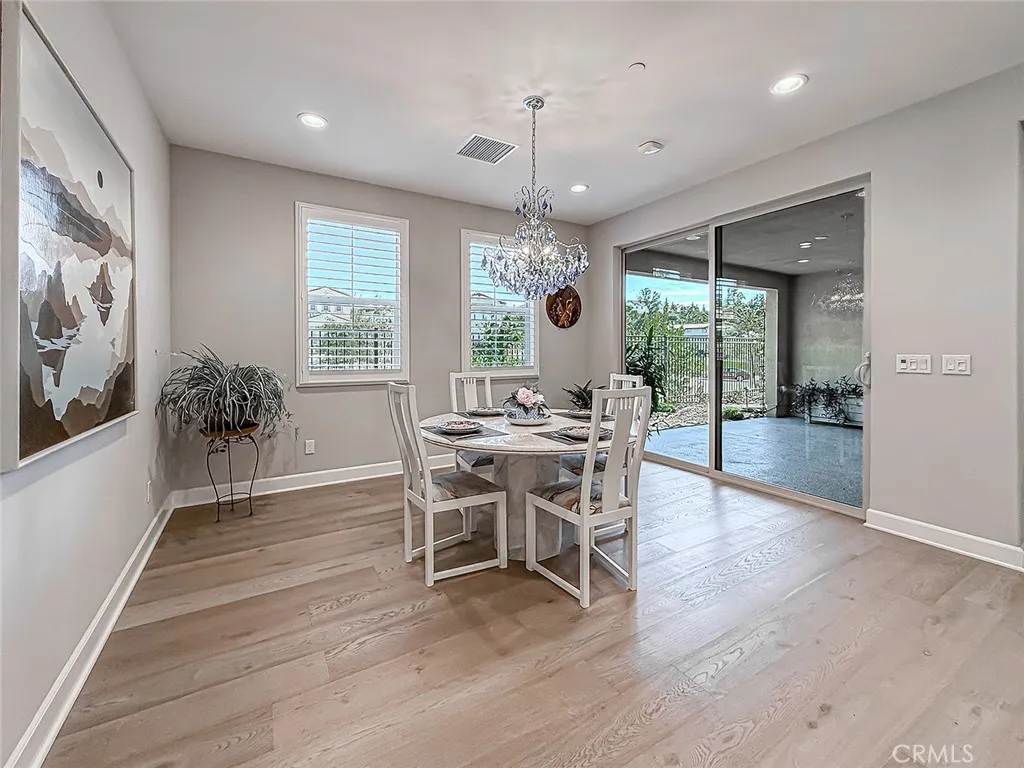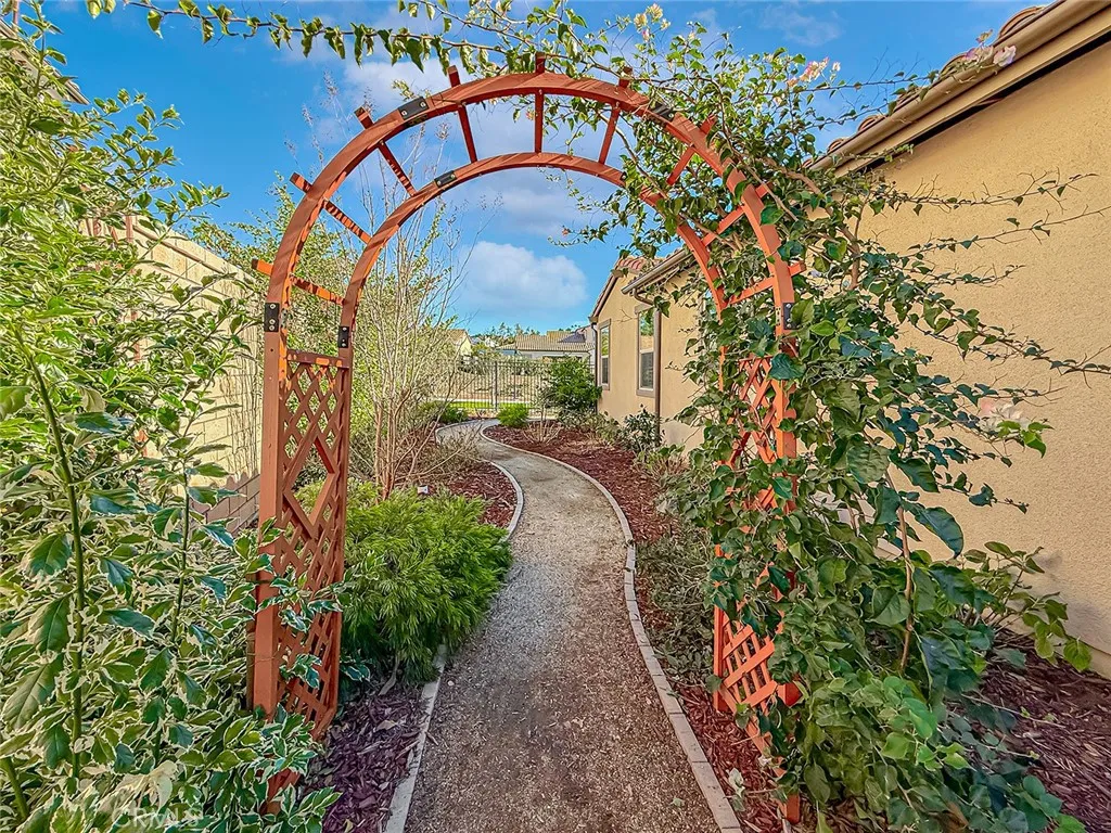 This highly coveted Citron Plan 3 home sits on a premium view lot and does not disappoint! Filled with amazing upgrades throughout, it offers luxurious style in the exclusive Grove 55+ gated community. Upon entering you immediately notice the gorgeous neutral color of the real wood flooring and the natural light flooding in from many windows showcasing the views. This property does not back to another home, providing an open, spacious feeling. This layout is highly sought after for the open flow and large kitchen with an island facing the living space, providing a great room ideal for gatherings and connected daily life. The kitchen features stunning marble counters and backsplash, Monogram appliances, custom cabinetry, and a large basin style sink. The dining room, situated within the large living space, features a gorgeous blue accented chandelier to match the kitchen. Having three bedrooms/three full baths allows for flexible living options and a more private guest space. Two of the bedrooms have large ensuite baths, with the third full bath located right next to the third bedroom. All baths have tile floors and matching tiling in the shower and baths. The primary shower has 12x24 tiles running from floor to ceiling which adds an elevated touch. From plantation shutters and custom window coverings, wood casing around each entry way, recessed lighting, a Fall Scan water softener, EV wiring, and epoxy flooring in the garage and the back patio, there is attention to detail everywhere you look. The backyard has been meticulously crafted into a botanical paradise, fully lands