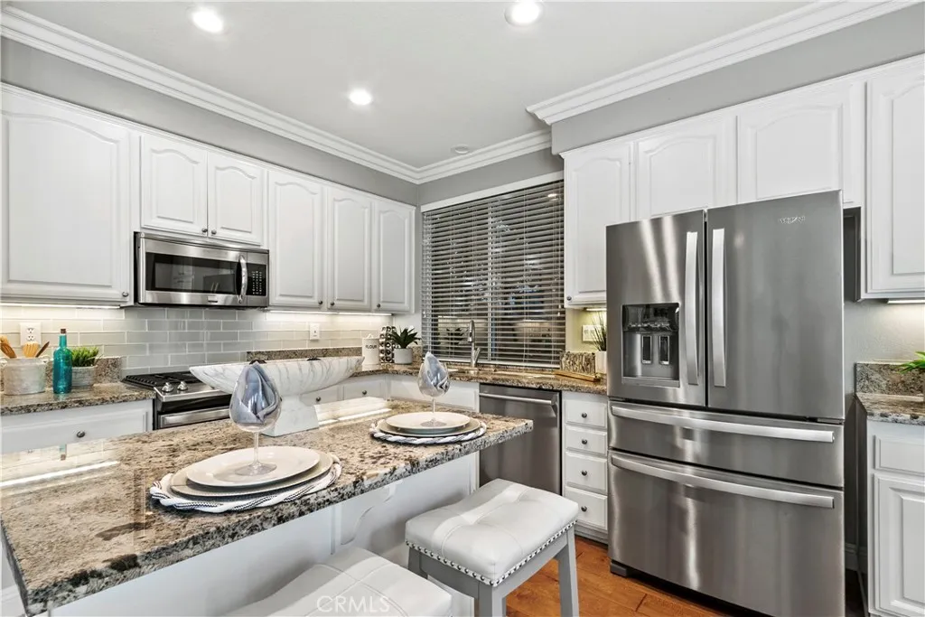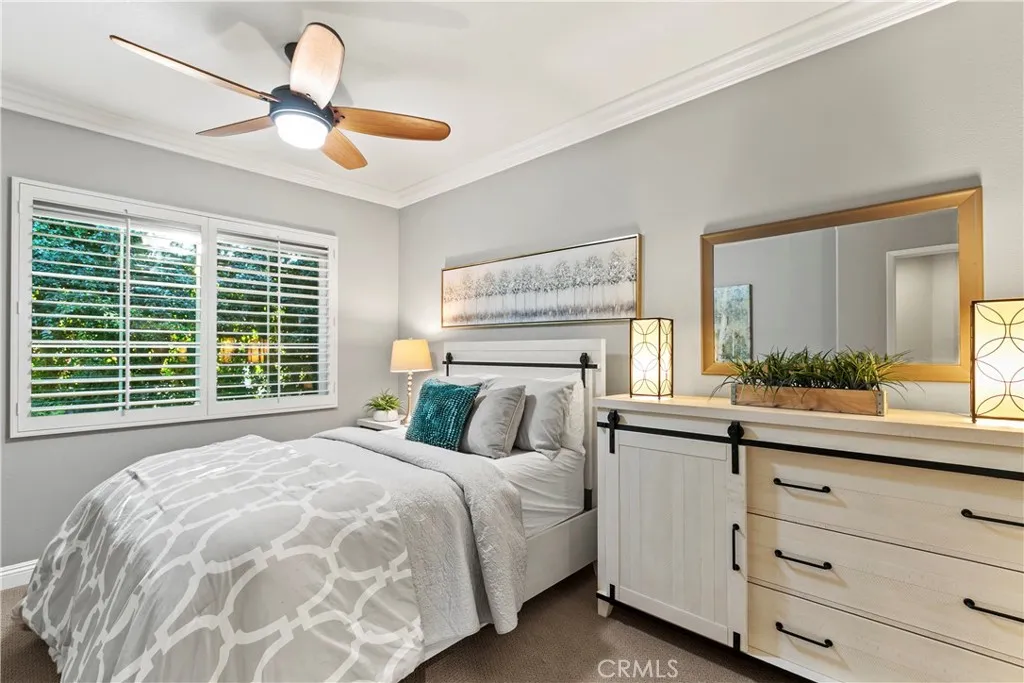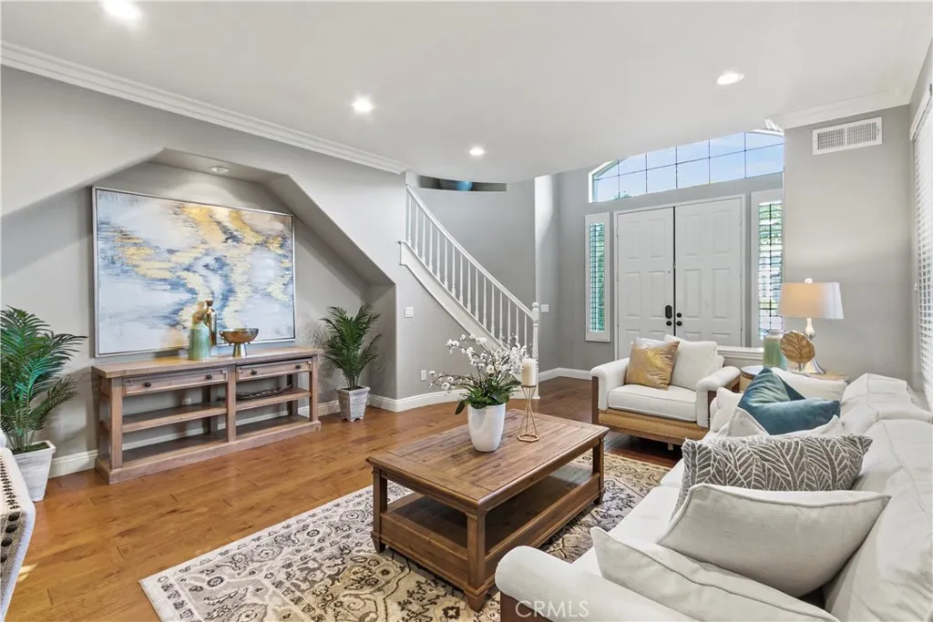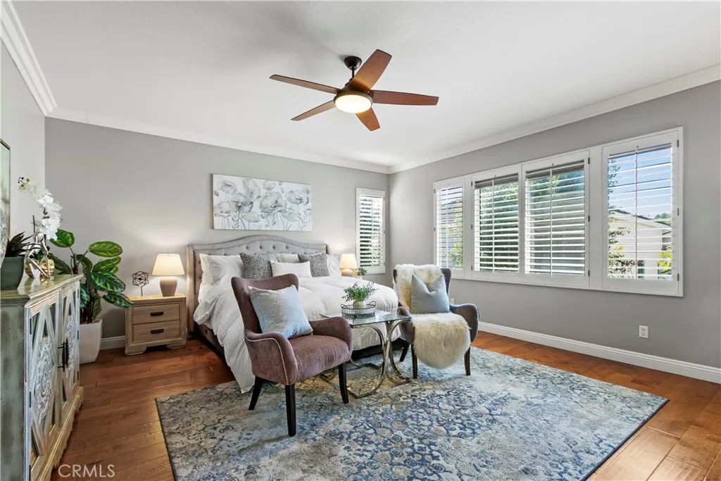 Situated in the desirable Memory Lane tract, this 5-bedroom plus loft home offers the largest floor plan in the neighborhood, expanded by 448 square feet with a bedroom and loft addition above the living room. The main level welcomes you with formal living and dining areas, complete with a dedicated wine closet, and flows seamlessly into a spacious family room with a fireplace. The updated kitchen features a center island, breakfast nook, granite countertops, walk-in pantry, and stainless-steel appliances. Also on the main level is a full bathroom and a bedroom or office with a built-in Murphy bed and direct access to the backyard. Upstairs, youll find a versatile loft, a laundry room, and the remaining bedrooms. The expansive primary suite offers two walk-in closets with custom organizers and an en-suite bathroom with a soaking tub, separate shower, and dual sinks. Two additional bedrooms share a Jack-and-Jill bathroom. Throughout the home are hardwood floors, carpeting, shutters, and crown molding. Enjoy excellent curb appeal with new exterior paint and a backyard designed for entertaining, featuring a patio, hot tub, and putting green. Ideally located near Canyon Vista Elementary and Soka University, this standout home combines extra living space with a highly sought-after neighborhoodschedule your tour today