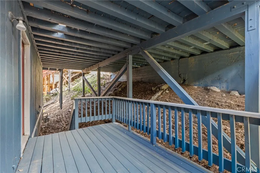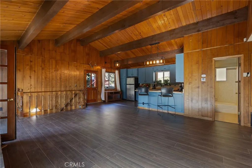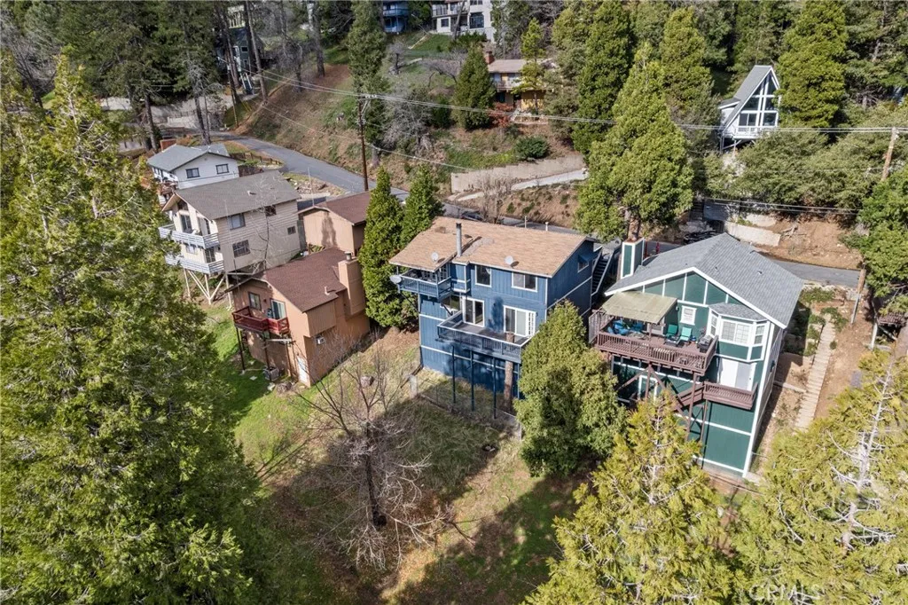 Welcome to this inviting three-bedroom, two full-bathroom home nestled among the pines of Crestline, offering 1,872 sq ft of living space on a 6,350 sq ft lot. Designed for comfort and versatility, the home features a desirable south facing orientation with multiple decks to enjoy the year round sunshine and tranquil forest views, and a completely Level 3 car parking deck attached to the property. Step inside to a spacious family room where soaring wood-beamed ceilings, tongue and groove wood paneling, and a stunning rock cladded center fireplace create a warm mountain ambiance. Just off the main living area, double doors open to a covered upper patio...perfect for relaxing or entertaining. The kitchen offers ample cabinetry, updated lighting, and included appliances. Upstairs, youll find two cozy bedrooms, each with ceiling fans, and a full bathroom that serves the level. Downstairs extends the living potential with a large game room currently outfitted with a pool table and dart area, with another opening to a second expansive south-facing deck. The lower level also features the primary suite with charming wood cladded walls, a ceiling fan, and a beautifully updated bath showcasing a subway tiled soaking tub and separate shower. Convenient laundry room access leads directly to the lower deck, offering some amazing seamless indoor-outdoor flow.. away from the elements. Additional highlights include central heating and air conditioning, parking for up to three vehicles with a level entry deck, and prescriptive easement(s) benefiting the property. Located on a quiet street y
