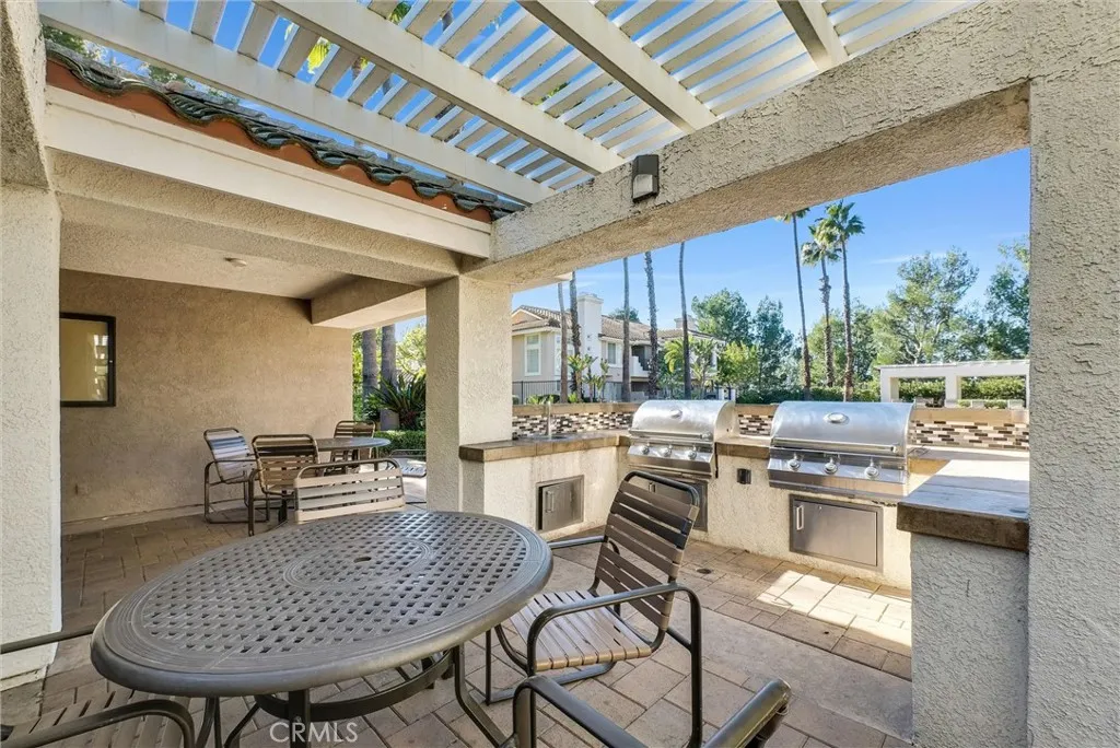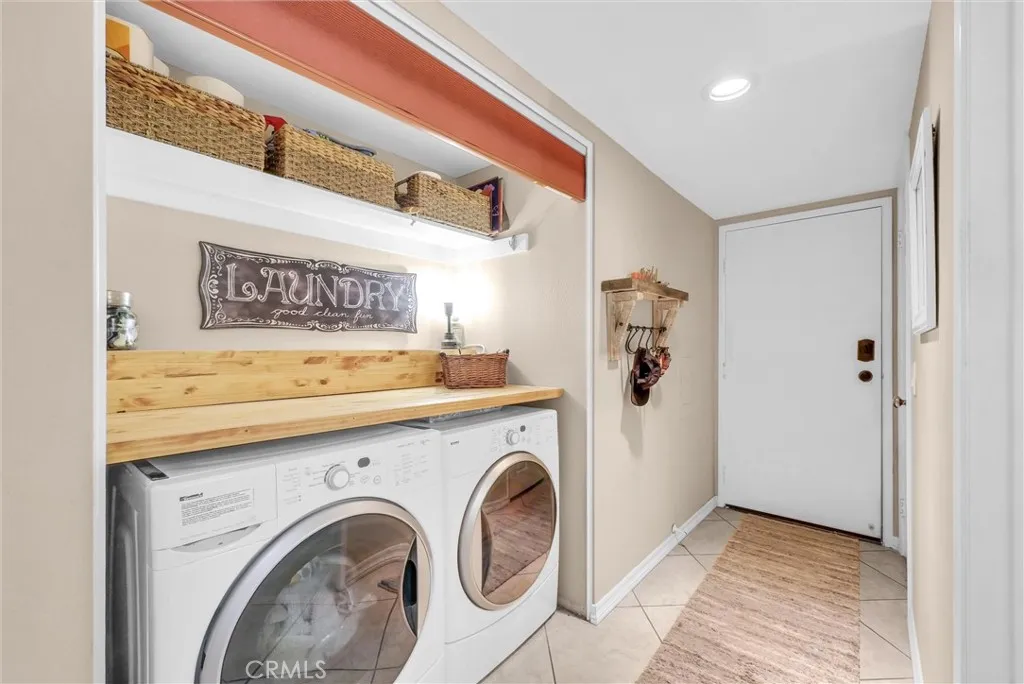 A truly rare opportunity awaits in the prestigious, gated Viewpointe community of Anaheim Hills. This highly desirable ground-floor, single-story 2-bedroom, 2-bath residence offers the convenience of no interior stairs, an attached garage, and effortless indoor-outdoor living. Step inside to a bright, open-concept floor plan featuring a spacious living area with a cozy fireplace, a renovated kitchen, and an adjacent dining space ideal for entertaining. The airy kitchen showcases recessed lighting, granite countertops, nickel hardware accents, ample prep space, and a newer dishwasher. The expansive primary suite is a private retreat, complete with mirrored wardrobe closets, direct patio access via a double slider, and a beautifully remodeled ensuite bathroom featuring dual vanities, custom lighting, and an upgraded shower. The secondary bedroom also offers mirrored wardrobe closets and versatility as a guest room, home office, or gym. Guest restroom includes bathtub with subway tile and updated vanity. Crown molding and low-maintenance ceramic tile flow throughout the main living areas, while both bedrooms feature upgraded laminate flooring. The oversized private patio, accessible from both the living room and primary bedroom, is perfect for morning coffee or evening relaxation. Additional highlights include in-home laundry hookups with washer and dryer included, a newer water heater, direct access to a private one-car garage with overhead storage, plus an assigned covered carport conveniently located just across the drive. Viewpointe residents enjoy resort-style amenities i