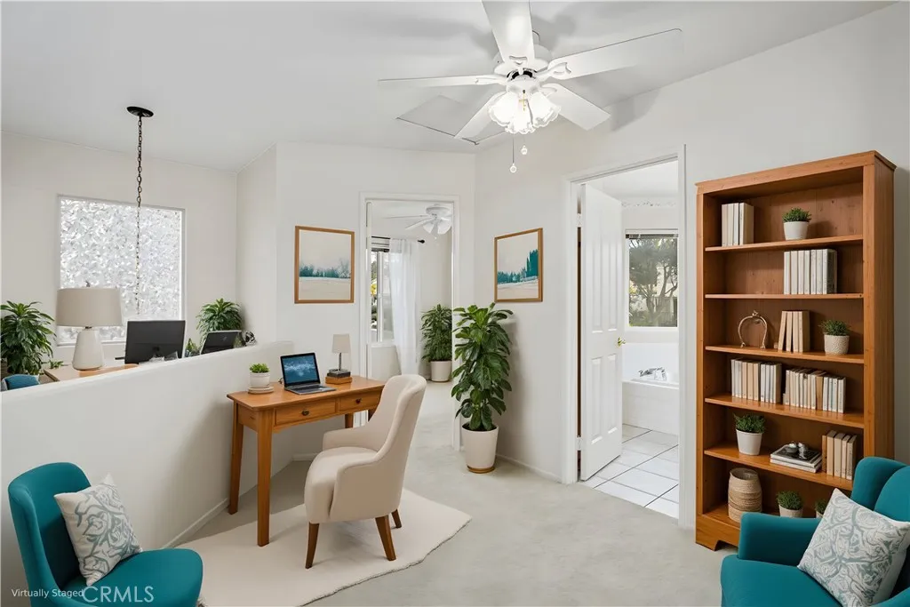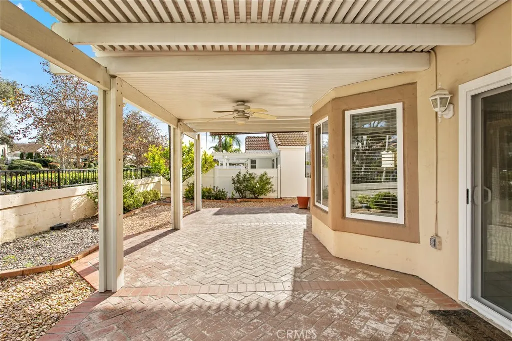 LOCATION! LOCATION! Beautiful home in The Colony, a prestigious 55+ gated community in Murrieta. This 1,722 sq ft charmer features 3 beds, 2.5 baths, and a spacious 2 car garage with room for a golf cart, workshop, or extra storage. The Colony is known for its gorgeous golf course, incredible clubhouse, and top tier amenities. The HOA maintains the front yard, and the low maintenance/ low-water backyard is ready for your green thumb! Enter through double doors into a large, open foyer. To the right is the expansive family room with vaulted ceilings, abundant natural light, a cozy gas fireplace, and luxury laminate wood flooring. To the left, the dining room offers tile floors, large vinyl windows, and sliding doors leading to the covered patio and custom concrete porch with a convenient pass through to the kitchen. The upgraded kitchen includes a breakfast nook, ample storage, granite countertops and backsplash, and a boxed ceiling with recessed lighting for a modern feel. There is plenty of counter space and cabinetry for hosting family gatherings. Past the family room is the primary ensuite, featuring a spacious bedroom with vaulted ceilings, storage, and a full bathroom with a separate tub, stand up shower, dual walk-in closets, and a dual sink vanity with custom quartz countertops. Across the hall, the utility room includes cabinetry, a sink, and included washer and gas dryer. The upgraded half bath offers granite countertops and a large mirror. Upstairs are two well sized bedrooms, a shared bath with storage, tub, and vanity, plus a perfect nook for a desk or study are