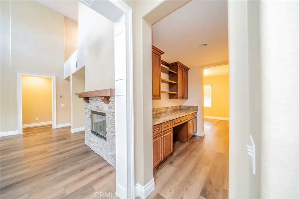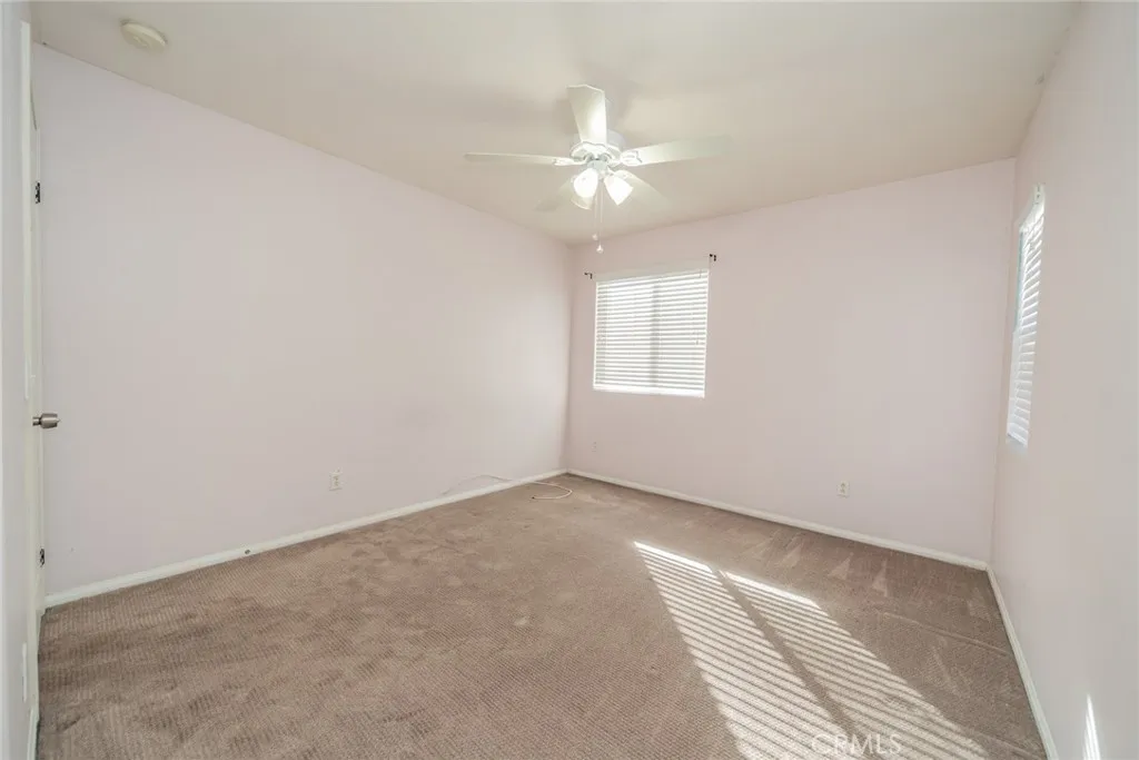 Gorgeous 4-bedroom, 2.5-bath residence with a 4-car garage with courtyard entrance, located in a quiet and highly desirable Perris neighborhood at the end of the Cul-De-Sac, right next to Monument Ranch Park and very close to Granite Hills Elementary School. NEW 2 BRAND-NEW AIR CONDITIONERS & SYSTEM!!! NEW LARGE WATER HEATER!! This beautifully designed home offers a spacious open floor plan with a HUGE primary suite on the FIRST LEVEL!!! complete with a spa-like bathroom, separate shower, oval bathtub, and walk-in closet, along with an additional spacious bedroom downstairs. Upon entering the family room, enjoy soaring two-story ceilings that include a refined ceiling fan and abundant natural light. Thoughtfully designed for comfort and entertaining, the main level features separate, generous living and dining rooms, a customized built-in desk with fine cabinetry ideal for a home office, elegant laminated waterproof flooring, upgraded baseboards and crown molding, an enhanced fireplace, and stylish ceiling fans throughout. The gourmet kitchen with beautifully designed granite countertops boasts a large center island, a walk-in pantry!! perfect for gatherings. Downstairs large Laundry room with shelves!! Upstairs, a spacious loft with built-in storage overlooks the family room and is accompanied by two generously sized bedrooms and a large bathroom. The expansive 4-car garage offers ample space for parking and additional storage. The beautifully landscaped backyard features new turf, a decorative fountain, an upgraded covered patio with recessed lighting and ceiling fan thro