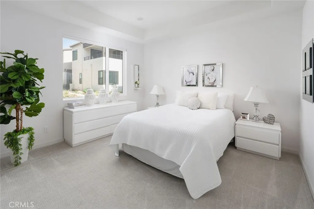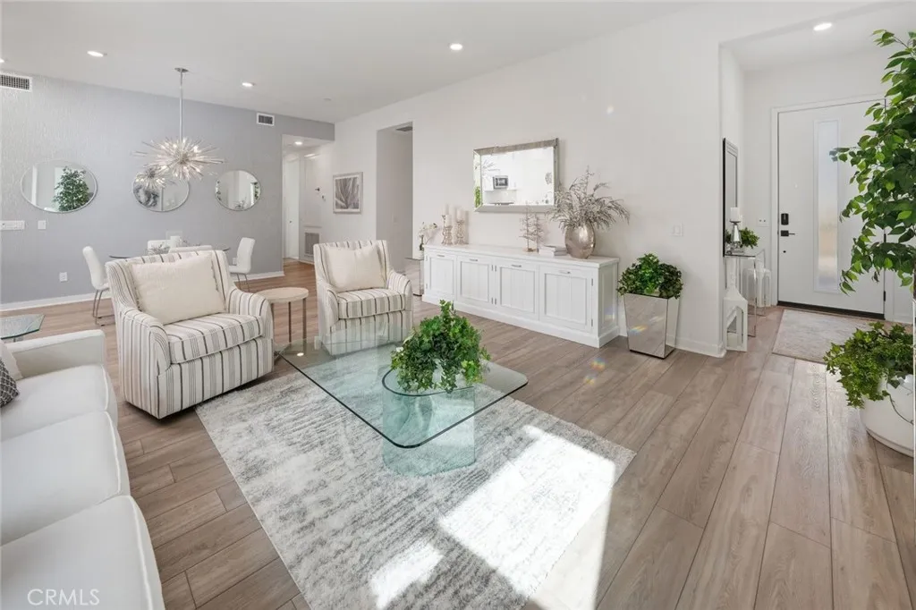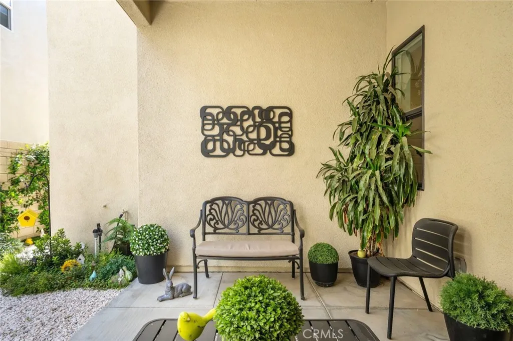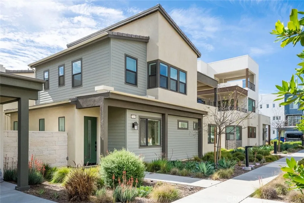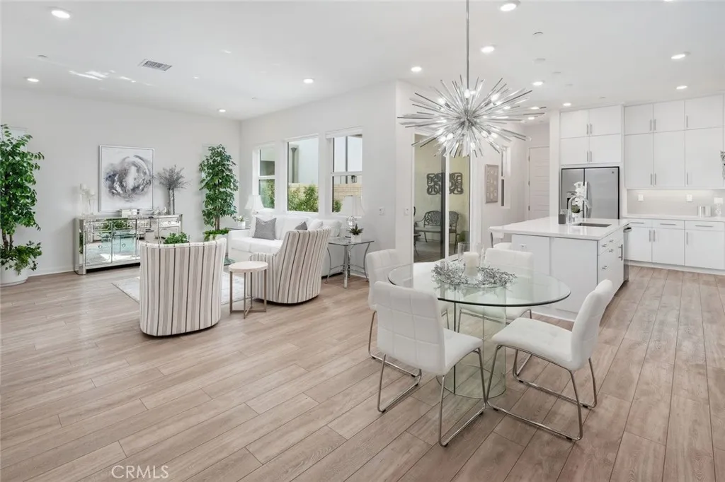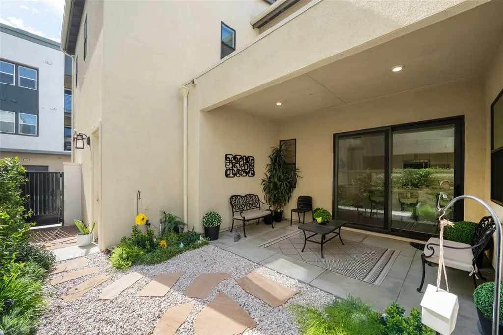 Absolutely stunning and rare 3 bed, 2 bath ground floor SINGLE STORY home in the highly sought after Rowan collection in Valencia's coveted FivePoint community. Beautifully appointed modern home featuring an open-concept floor plan with high ceilings, large picture windows, luxury vinyl plank flooring, and tons of designer upgrades. Can be purchased fully furnished! Step inside to the large living room bathed in natural light with views of the lovely courtyard through the oversized picture windows. The bright and airy living area flows seamlessly into the dining space featuring a beautiful feature wall and eye-catching chandelier. The gourmet kitchen is an entertainer's dream, showcasing quartz countertops, a huge island, designer backsplash, beautiful white cabinetry with brushed nickel hardware, a walk-in pantry, and high end stainless-steel appliances. From the kitchen, step through sliding glass doors to the charming and spacious covered courtyard - perfect for relaxing or outdoor get togethers. The primary suite offers plush carpeting, recessed lighting, custom window coverings, a generous walk-in closet, and a luxurious en-suite bathroom with dual quartz vanities and a walk-in shower. Two additional bedrooms include large closets, custom window coverings and abundant natural light. The full guest bath also features dual vanities, quartz counters, and a tub/shower combination. Additional highlights include a dedicated laundry room, attached two-car garage, EV charger and owned solar panels for enhanced energy efficiency. Residents of the FivePoint community enjoy resor