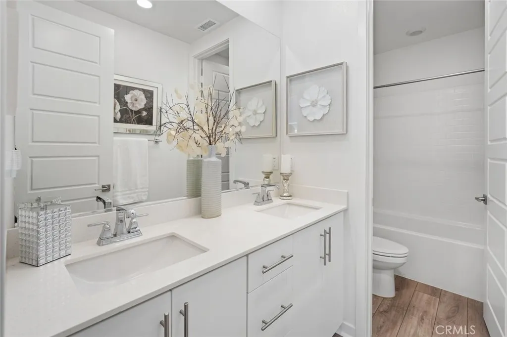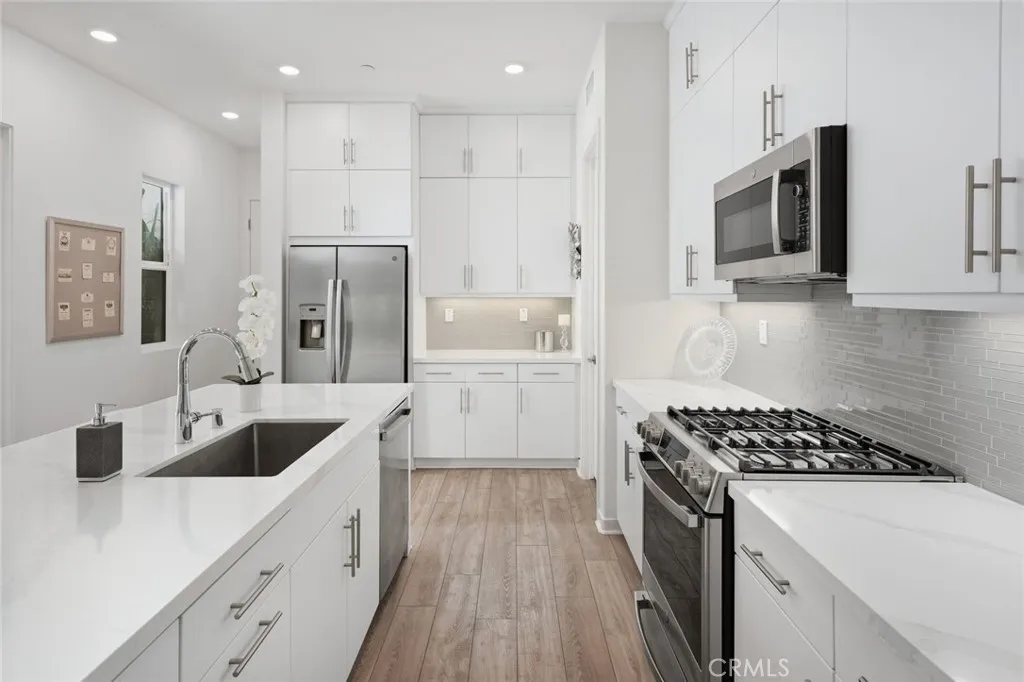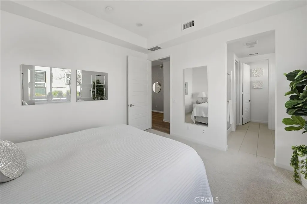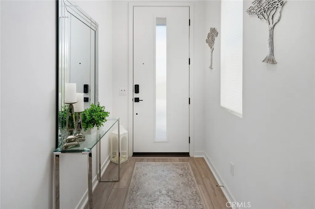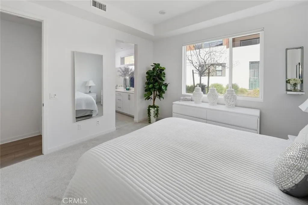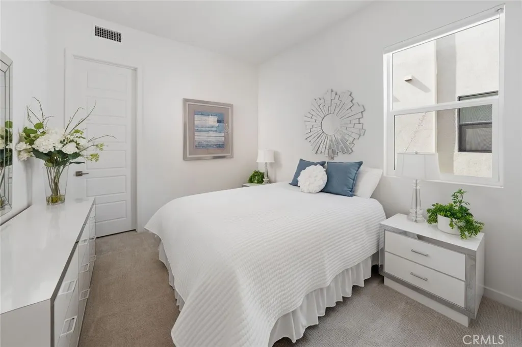 Absolutely stunning and rare 3 bed, 2 bath ground floor SINGLE STORY home in the highly sought after Rowan collection in Valencia's coveted FivePoint community. Beautifully appointed modern home featuring an open-concept floor plan with high ceilings, large picture windows, luxury vinyl plank flooring, and tons of designer upgrades. Can be purchased fully furnished! Step inside to the large living room bathed in natural light with views of the lovely courtyard through the oversized picture windows. The bright and airy living area flows seamlessly into the dining space featuring a beautiful feature wall and eye-catching chandelier. The gourmet kitchen is an entertainer's dream, showcasing quartz countertops, a huge island, designer backsplash, beautiful white cabinetry with brushed nickel hardware, a walk-in pantry, and high end stainless-steel appliances. From the kitchen, step through sliding glass doors to the charming and spacious covered courtyard - perfect for relaxing or outdoor get togethers. The primary suite offers plush carpeting, recessed lighting, custom window coverings, a generous walk-in closet, and a luxurious en-suite bathroom with dual quartz vanities and a walk-in shower. Two additional bedrooms include large closets, custom window coverings and abundant natural light. The full guest bath also features dual vanities, quartz counters, and a tub/shower combination. Additional highlights include a dedicated laundry room, attached two-car garage, EV charger and owned solar panels for enhanced energy efficiency. Residents of the FivePoint community enjoy resor