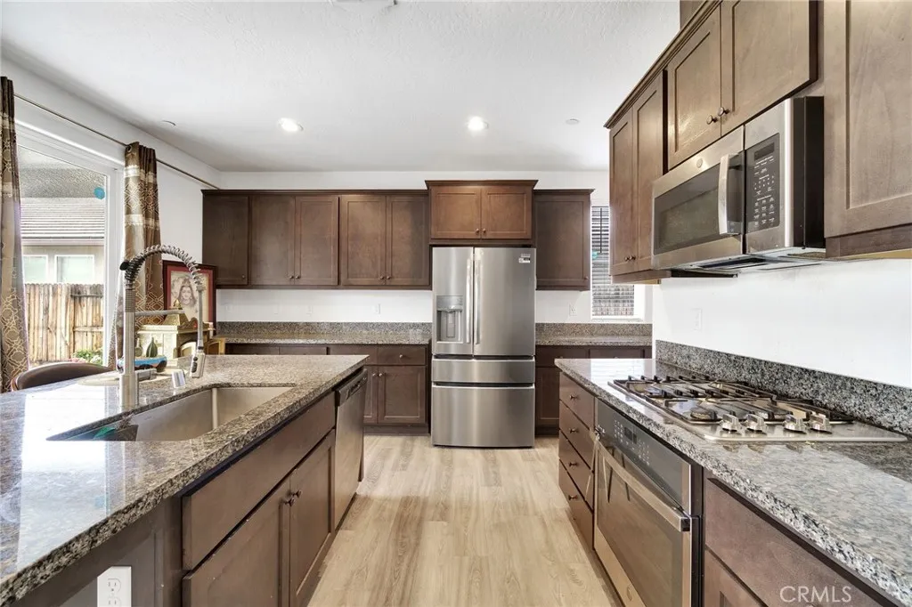 Welcome to this beautifully upgraded 4-bedroom, 3-bath home situated on a spacious 6,200 sq ft lot, offering both privacy and room to grow. The gourmet kitchen features stainless steel appliances, a stylish farm sink, elegant light fixtures, and under-cabinet lighting that creates a warm and inviting atmosphere. Enjoy upgraded finishes throughout, including sleek vinyl flooring in the main living areas and plush carpeting in the bedrooms. The bathrooms are thoughtfully designed with granite and quartz countertops, adding a touch of luxury. Step outside to a covered patioperfect for relaxing or entertaining guests. Conveniently located with easy access to major freeways, this home offers the ideal blend of comfort, style, and accessibility. Don't miss the opportunity to make this exceptional property yoursschedule a showing today!