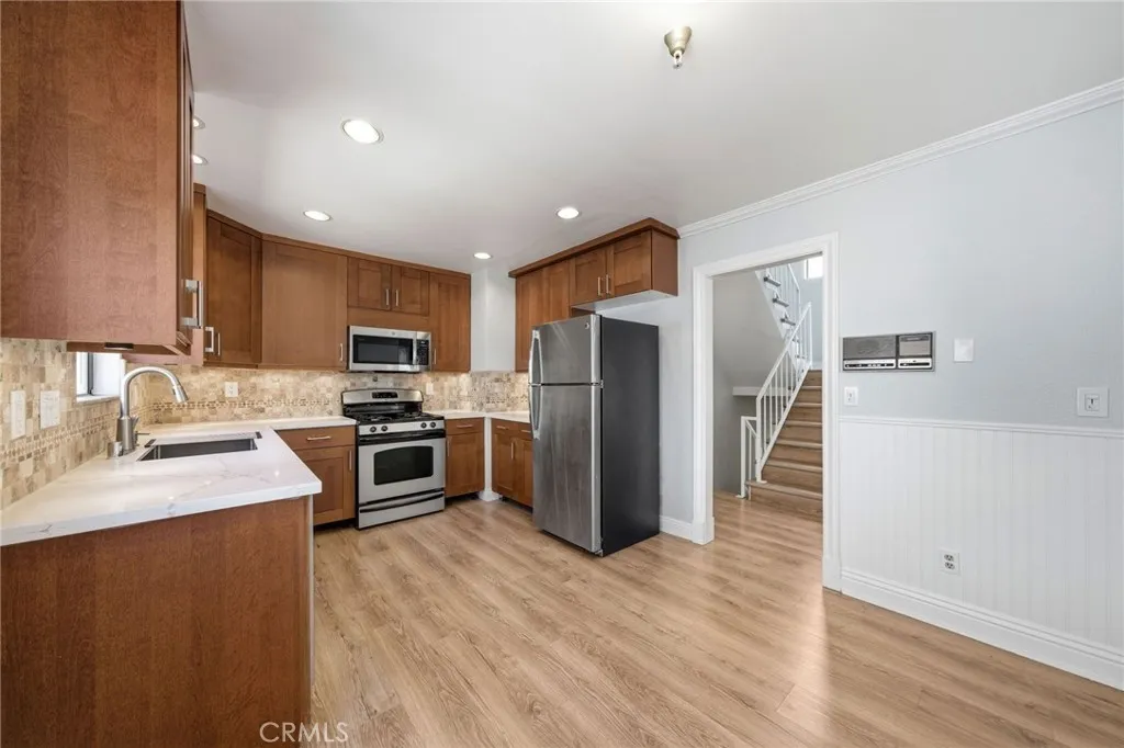 Well-located in North Lawndale, just minutes from South Bay beaches, this beautifully updated 3-bedroom,2.5-bath condominium offers approximately 1,531 sq ft of comfortable living space. The home features high vaulted ceilings and water resistant autumn cider oak laminate flooring throughout,creating a bright and cohesive interior. The kitchen has been updated with newer countertops,sink,and appliances (2022). The primary suite includes a remodeled walk-in closet with custom shelving. Additional features include recessed lighting,modern updated bathrooms, and attached 2-car garage with Epoxy-coated flooring. HOA amenities are pool and jacuzzi. Newer washer and dryer are included in sale. 15 minutes to SOFI Stadium, 20 minutes to Manhattan Beach Pier, and close to freeway access. Come see this spacious home!