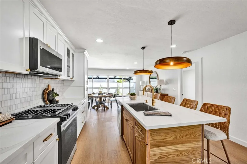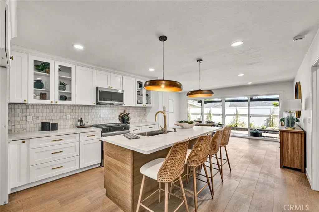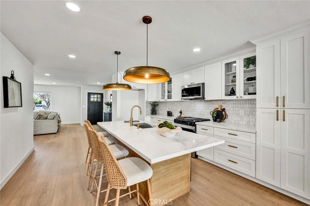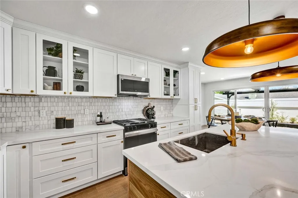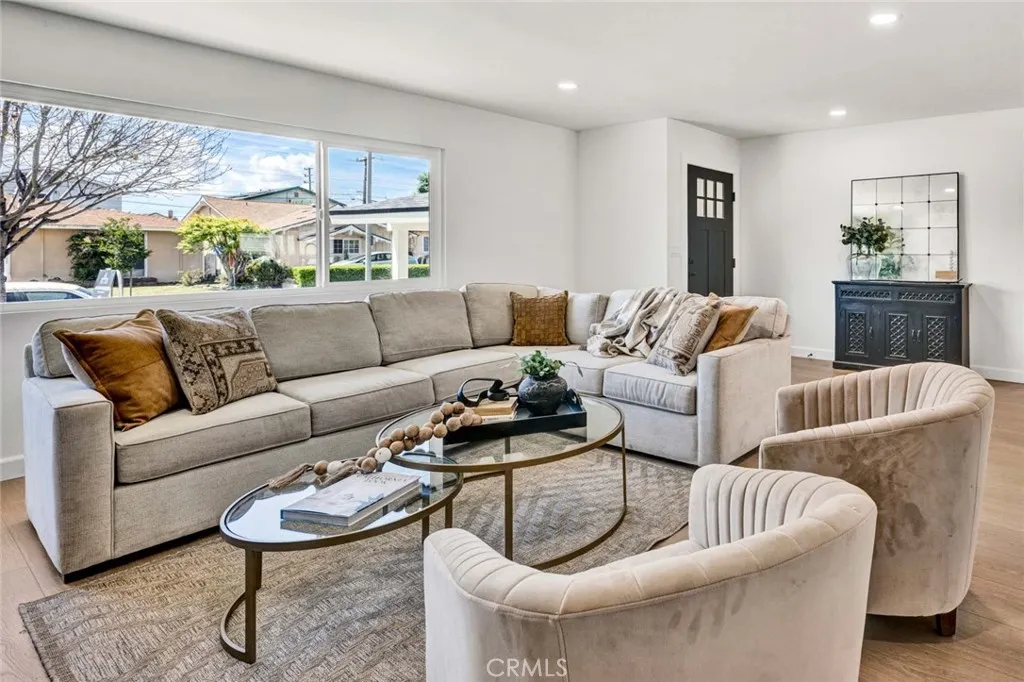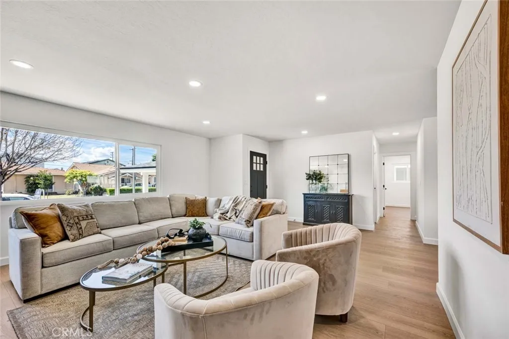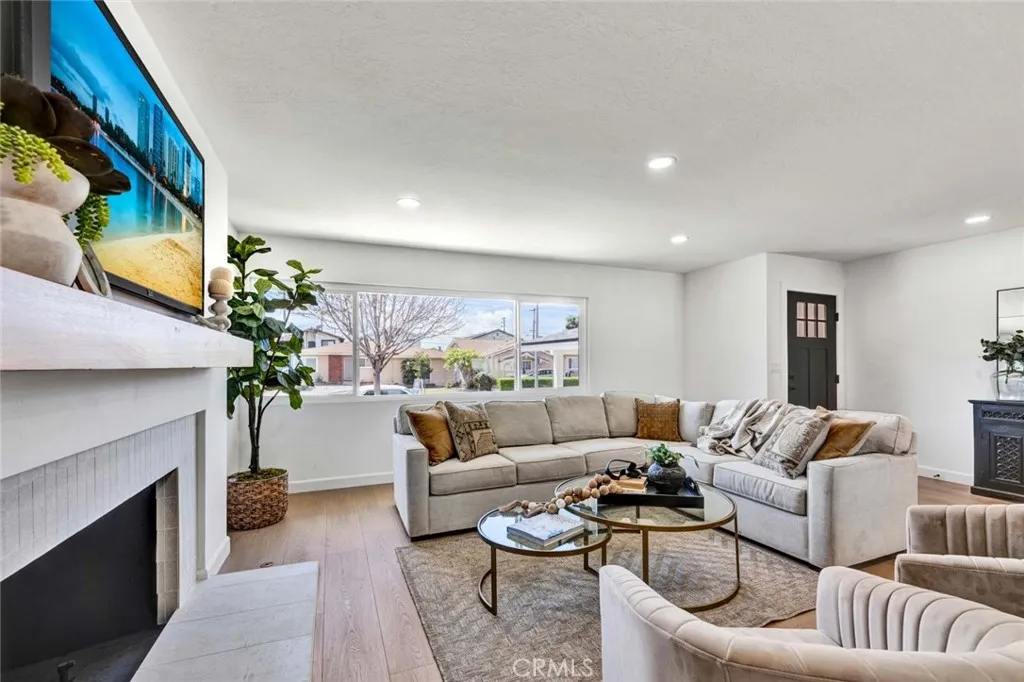 Stunning 3-bedroom, 2-bath fully remodeled home featuring convenient single-story living. This beautifully updated property showcases all-new windows, elegant vinyl flooring, and quartz countertops throughout. The chef-inspired kitchen is a true centerpiece, complete with stainless steel appliances, an extra-large island, and a custom backsplashperfect for both everyday living and entertaining. Both bathrooms have been completely upgraded with new fixtures, modern cabinetry, sleek shower doors, and dual sinks, offering a spa-like feel with custom tile work and stylish finishes. Enjoy recessed lighting and fresh interior paint that enhance the homes bright, contemporary ambiance. The private, quaint backyard is ideal for relaxing or entertaining, featuring a patio cover, newly stuccoed walls, and fresh landscaping. This move-in-ready home is a must-see!