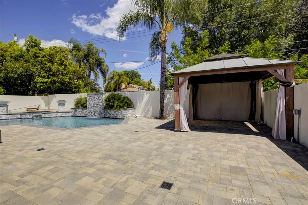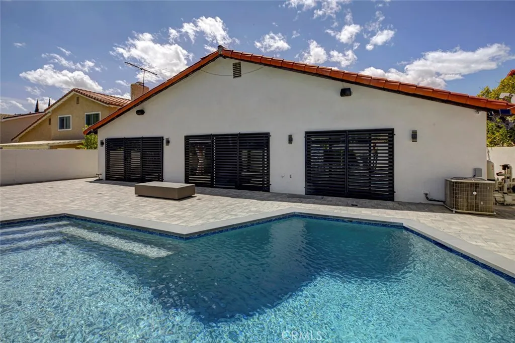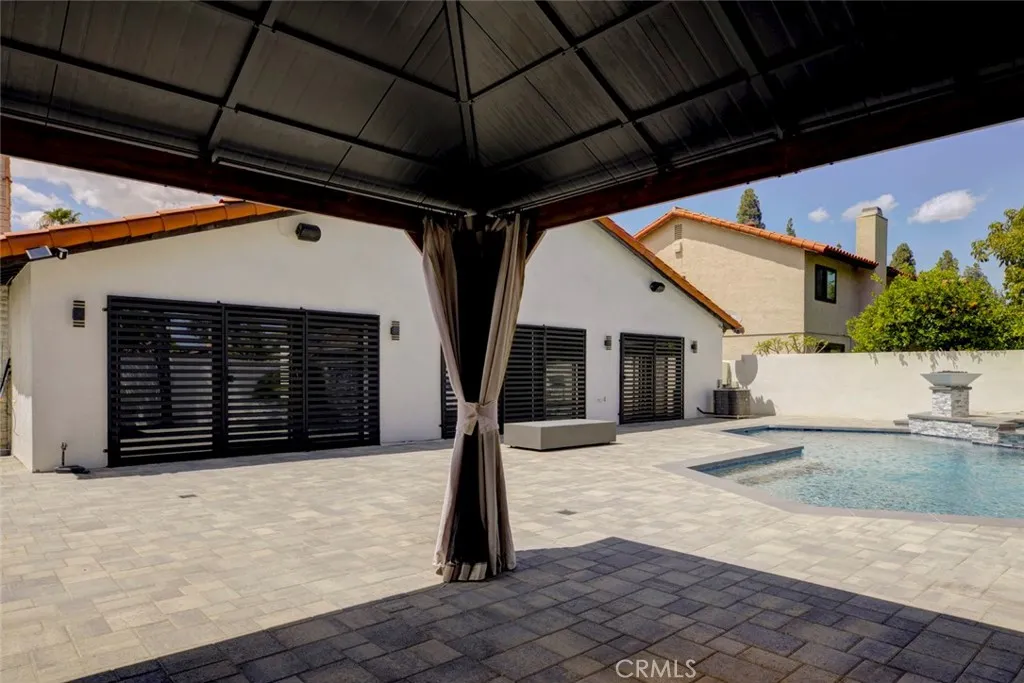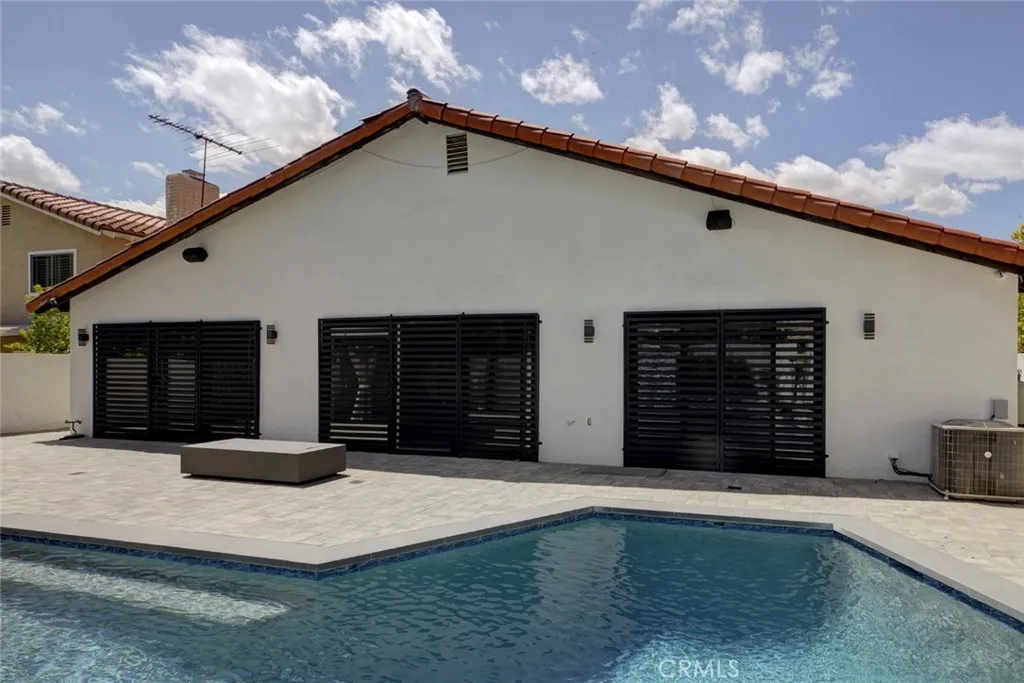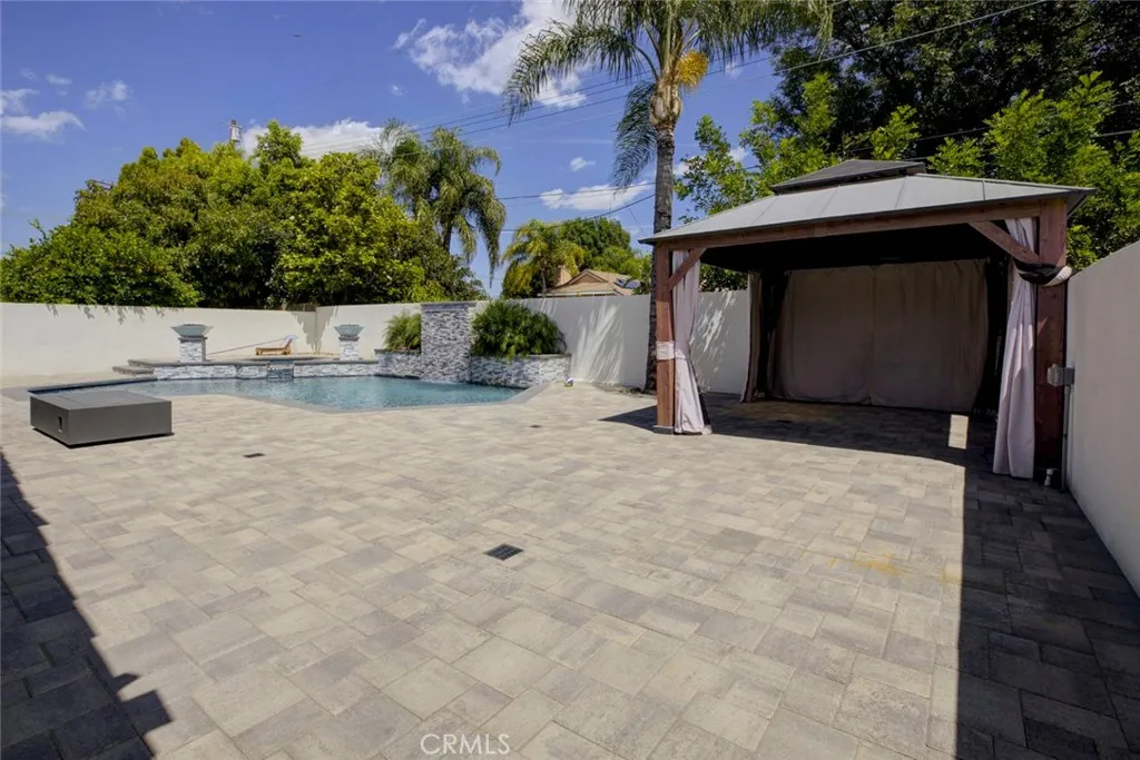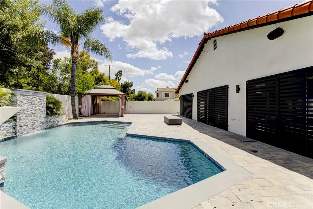 Welcome to this stunning 4-bedroom, 3-bathroom luxury home offering 2,353 sq ft of beautifully designed living space, complete with a resort-style pool and jacuzzi. A custom iron entry door and striking stucco detailing create an impressive first impression, while the modern entry with concrete slab accents sets the tone for the homes sophisticated design. Inside, youll find high ceilings, recessed lighting, laminate flooring, and a sleek electric fireplace that anchors the main living area. The chefs kitchen is a standout, featuring stainless steel appliances, glossy contemporary cabinetry, and elegant quartz countertopsperfect for both everyday living and entertaining. Additional highlights include central A/C and heating, built-in security cameras, a dedicated laundry room, and a 2-car attached garage with convenient direct access. Step outside to your own private oasis, complete with pavers, an aqua-blue pool and jacuzzi, a covered gazebo, swaying palm trees, and a custom waterfall featureideal for relaxing or hosting unforgettable summer gatherings.